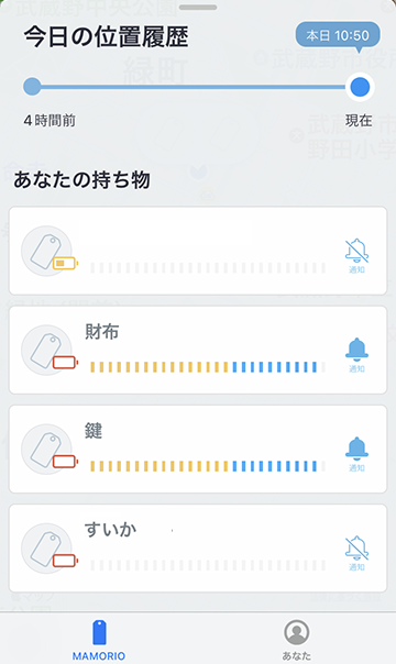 出先でカギを置き忘れてきても、60m以内に「カギ忘れてませんか?」って通知がくるし、お財布も同様。かなり安心します。